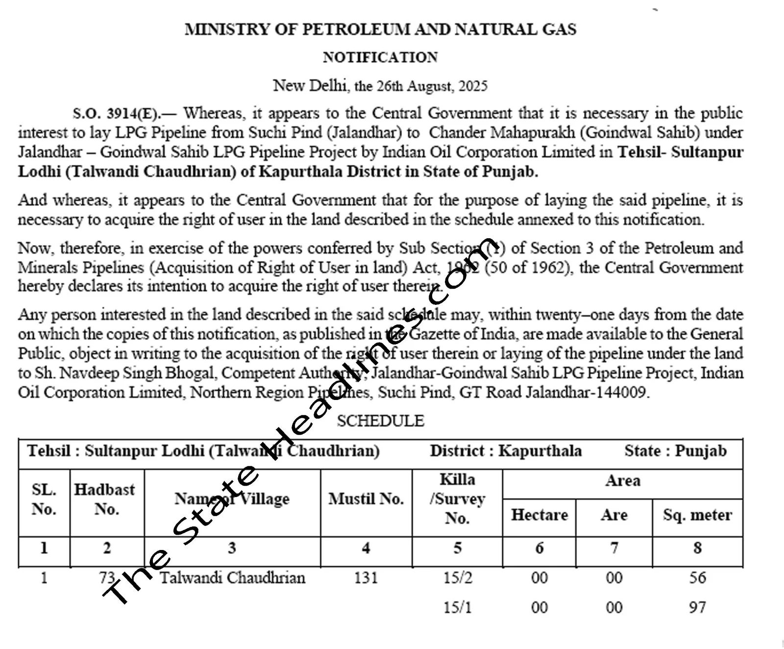 केंद्र के पेट्रोलियम व गैस मंत्रालय द्वारा एक नही बल्कि 2-2 नोटिफिकेशन जारी करते हुए कपूरथला जिले और जालंधर सड़क पर पड़ने वाले गांव की जमीनों को एक्वायर करने का आदेश जारी कर दिया है।