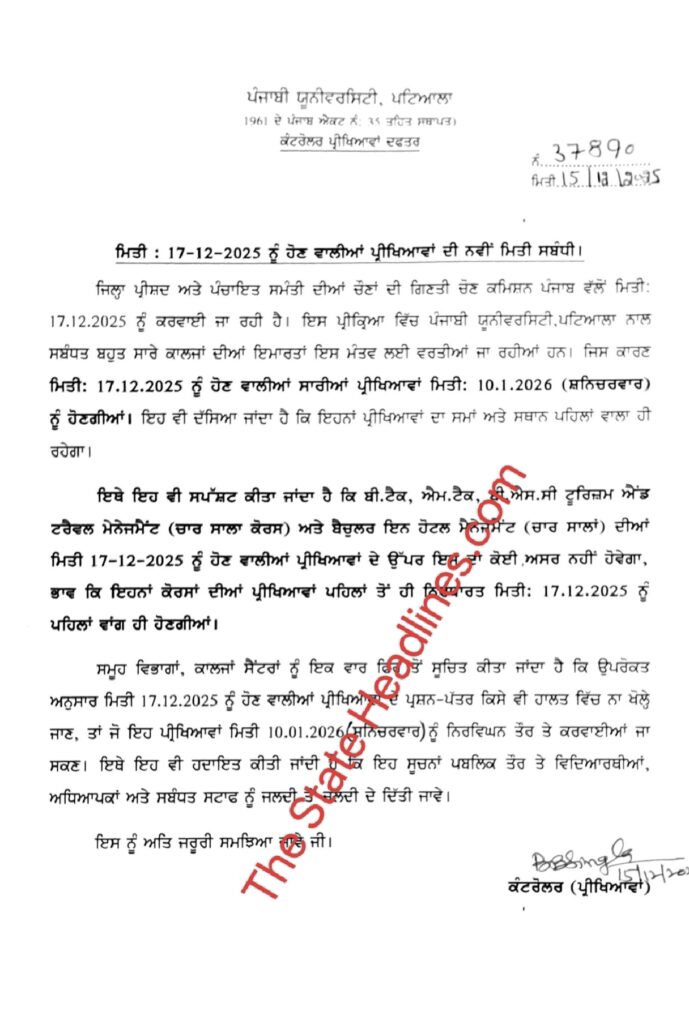 पंजाब में जिला परिषद और ब्लॉक समितियां के चुनाव की गिनती को लेकर अब असर पंजाबी यूनिवर्सिटी पटियाला की परीक्षाओं पर दिखाई देने वाला है क्योंकि जिला परिषद और पंचायत समिति के चुनाव की गिनती के लिए चुनाव कमीशन द्वारा ज्यादातर सरकारी व प्राइवेट कॉलेज को गिनती केंद्र घोषित कर दिया है और इन कॉलेज की बिल्डिंग में गिनती होने के चलते 17 दिसंबर को होने वाली परीक्षाओं को नहीं लिया जा सकता है। जिसके चलते पंजाबी यूनिवर्सिटी पटियाला की तरफ से एक आदेश परीक्षाओं को फिलहाल 10 जनवरी तक के लिए टाल दिया गया है। अब यह परीक्षाएं पहले से तय स्थान पर ही 10 जनवरी को होगी।