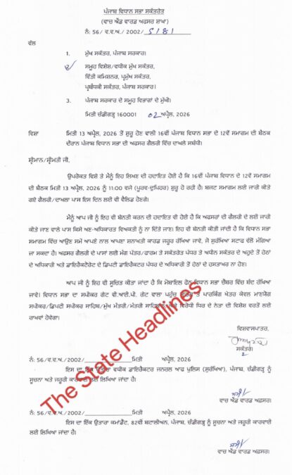 चंडीगढ़, 6 अप्रेल (The State Headlines)। पंजाब विधानसभा सचिवालय ने आगामी सत्र को लेकर सभी विभागों और अधिकारियों को सख्त निर्देश जारी किए हैं। अधिकारियों को कहा गया है कि अधिकारियो की गैलरी में कोई भी अनऑथराइज्ड व्यक्ति नहीं बैठा दिखाई देना चाहिए। उसके साथ ही जारी आधिकारिक पत्र के अनुसार 13 अप्रैल 2026 को होने वाले पंजाब विधानसभा के सत्र के दौरान अधिकारियों की गैलरी में बैठने को लेकर कड़े नियम लागू किए गए हैं।
