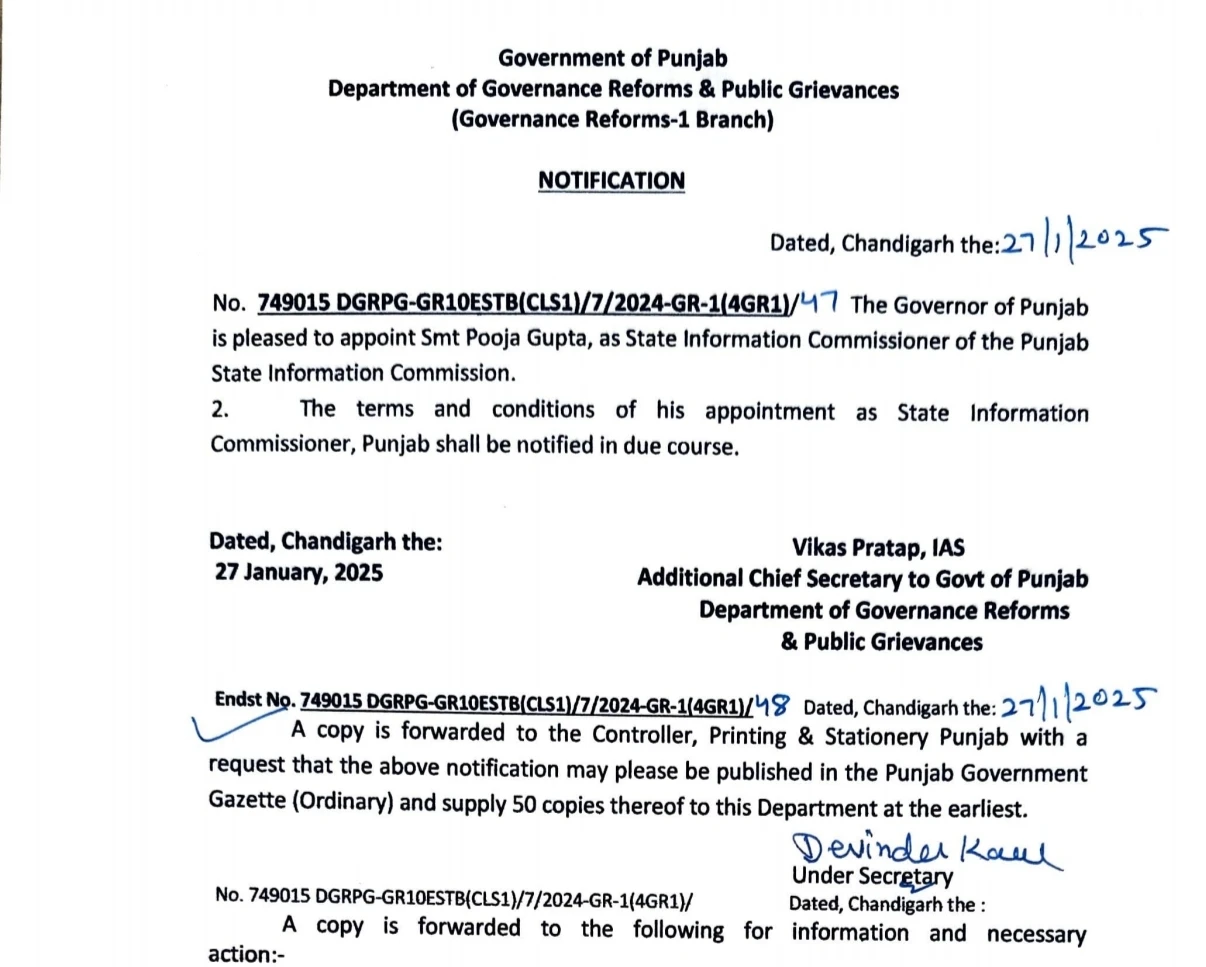 पंजाब सरकार की तरफ से पूजा गुप्ता को पंजाब राज्य सूचना कमीशन का कमिश्नर तैनात कर दिया गया।