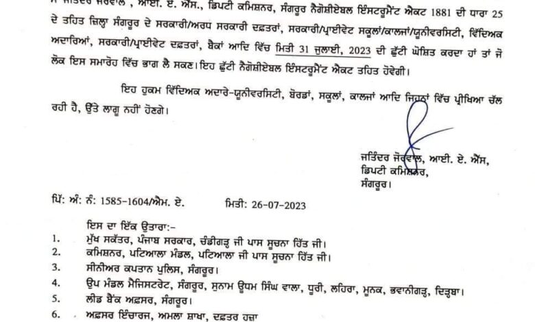 डिप्टी कमिश्नर के इन आदेशों के साथ ही संगरूर जिले में 31 जुलाई को छुट्टी रहेगी