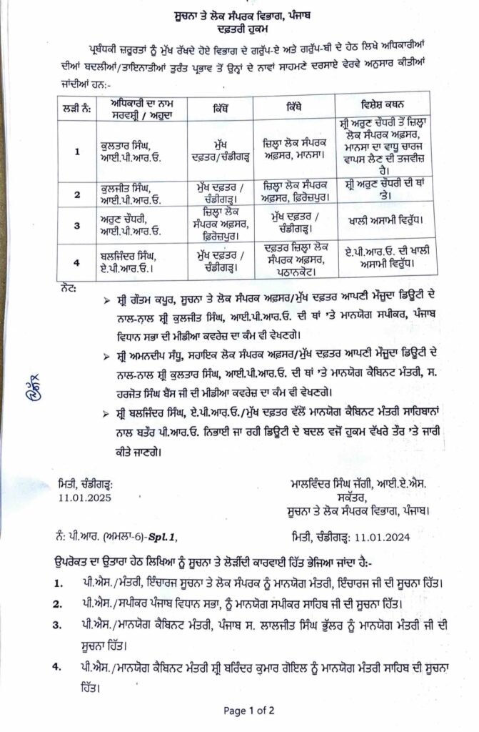 पंजाब के डीपीआर विभाग में छुट्टी वाले दिन कई पीआरओ के तबादले हुए उन्हें इधर से उधर कर दिया गया है। चंडीगढ़ के मुख्य विभाग से कुछ PRO को पंजाब में भेजा गया है तो कुछ PRO को पंजाब से चंडीगढ़ में तबादला किया गया है।