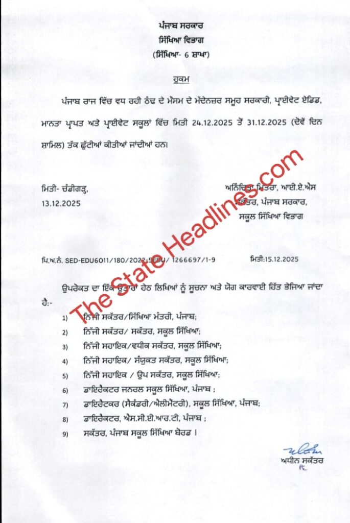 Winter Holidays :पंजाब के शिक्षा विभाग ने जारी किया पत्र